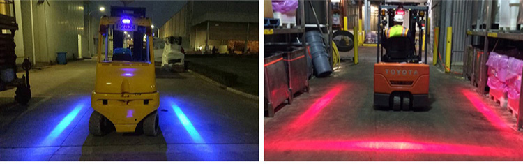 叉车蓝光灯为行人安全提供警示作用,以降低重型机械作业时周边意外事故发生的风险,红色或蓝色高度集中的光束照在地上,在机器的前方或后方投射出一个清晰可见的光亮区域,一次提醒工人们有机器正在靠近。在十分吵杂的工作环境下,比起声音警示灯,醒目的可见光束更加安全;